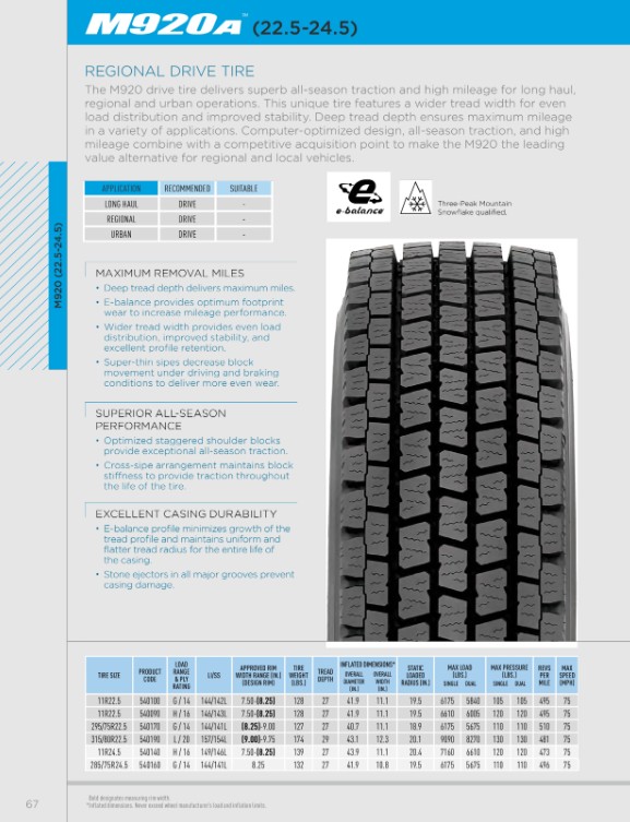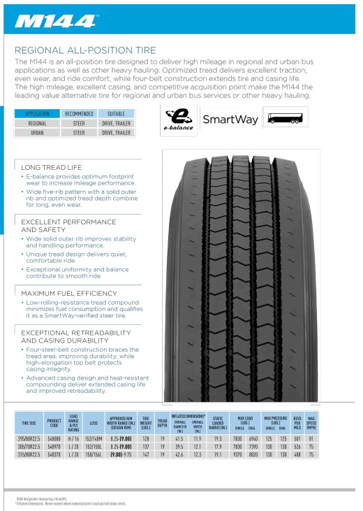 - SmartWay verified for select 22.5" & 24.5" sizes – Indicates better fuel efficiency and lower rolling resistance.